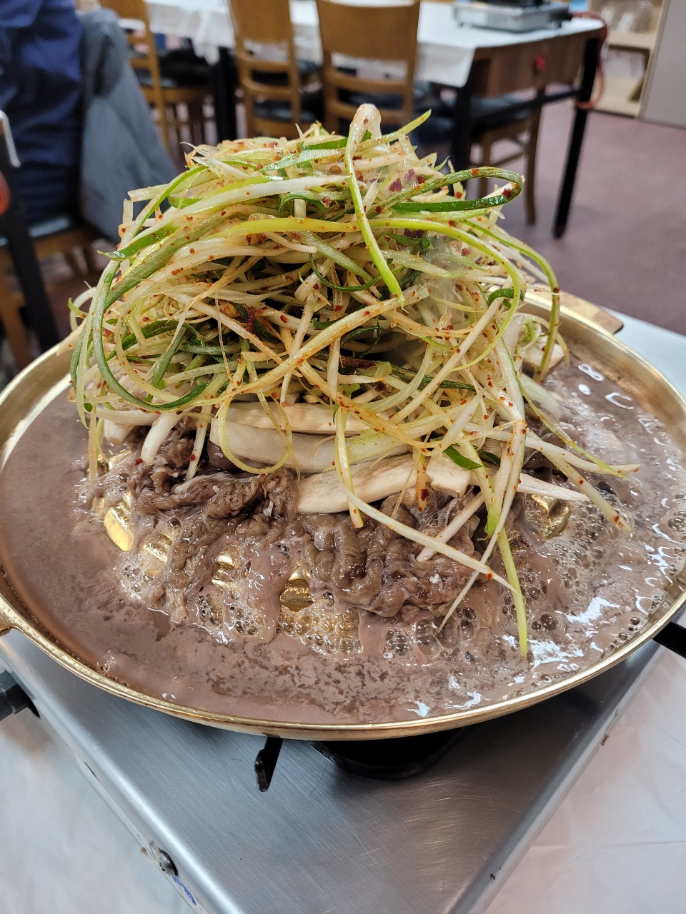 직원들이 불고기를 정성스럽게 세팅해 준다. 위 사진은 파불고기 2인분이다. 불고기에 버섯, 파채를 산더미처럼 쌓는다. 기본기에 충실한 맛이다. 특색있는 맛이라고는 할 수는 없지만 본래 아는 맛이 가장 무서운 법이다.