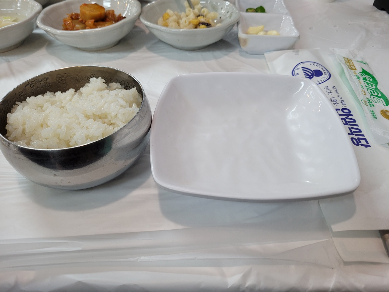 청결한 식당이다. 식기들이 깨끗하게 잘 닦여 있다. 수저는 종이커버로 쓰여 있다.