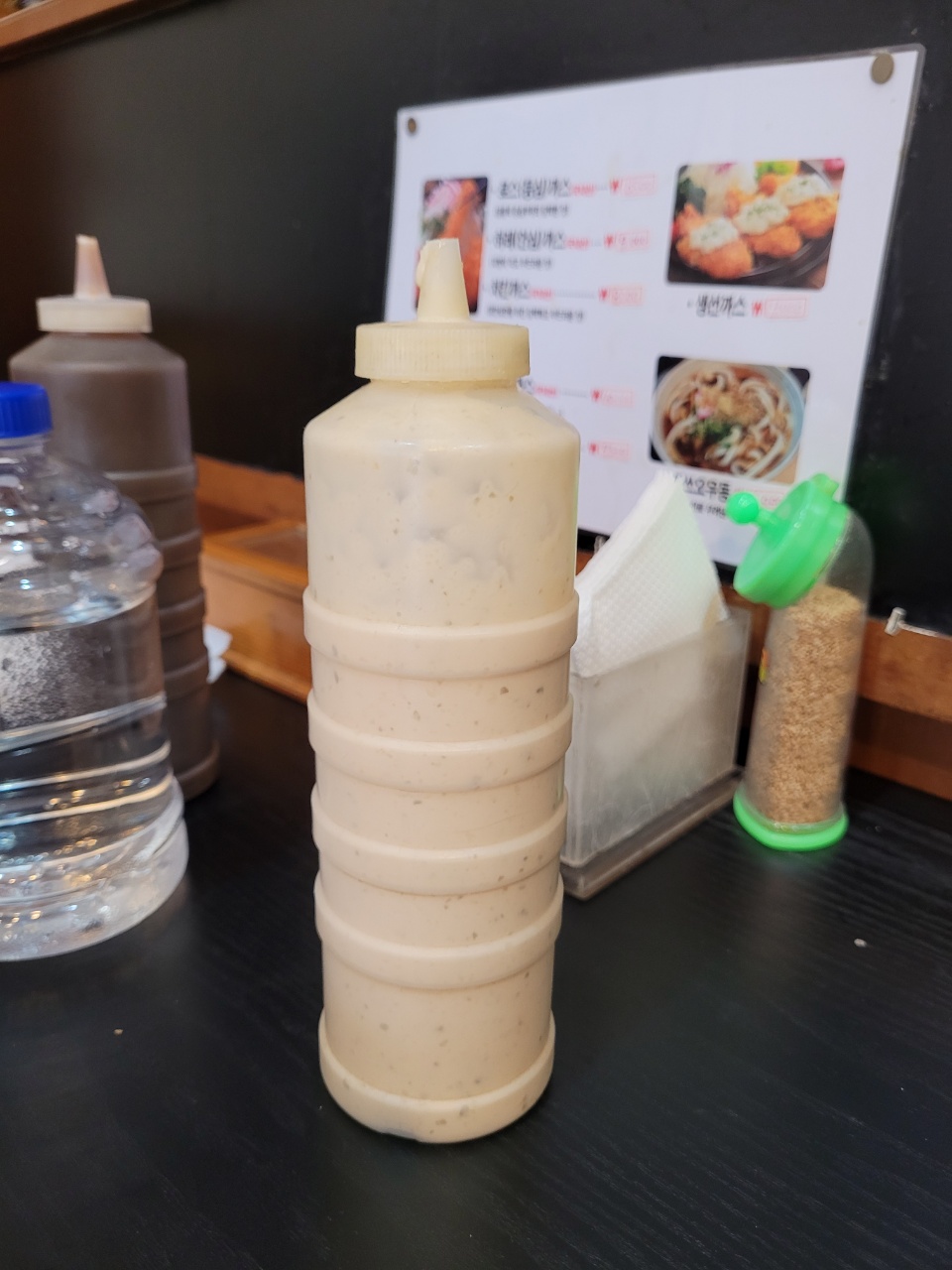테이블 마다 샐러드 소스와 돈까스 소스가 구비돼 있다. 깨는 직접 갈아서 넣어야 한다.