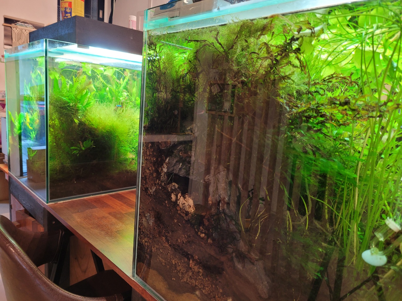 테이블마다 수초 수족관이 놓여있다. 저 사이에 앉아 있으면 아쿠아리움에 온 듯한 기분을 낼 수 있다. 내부는 전체적으로 습하다. 은은하게 물비린내도 난다.